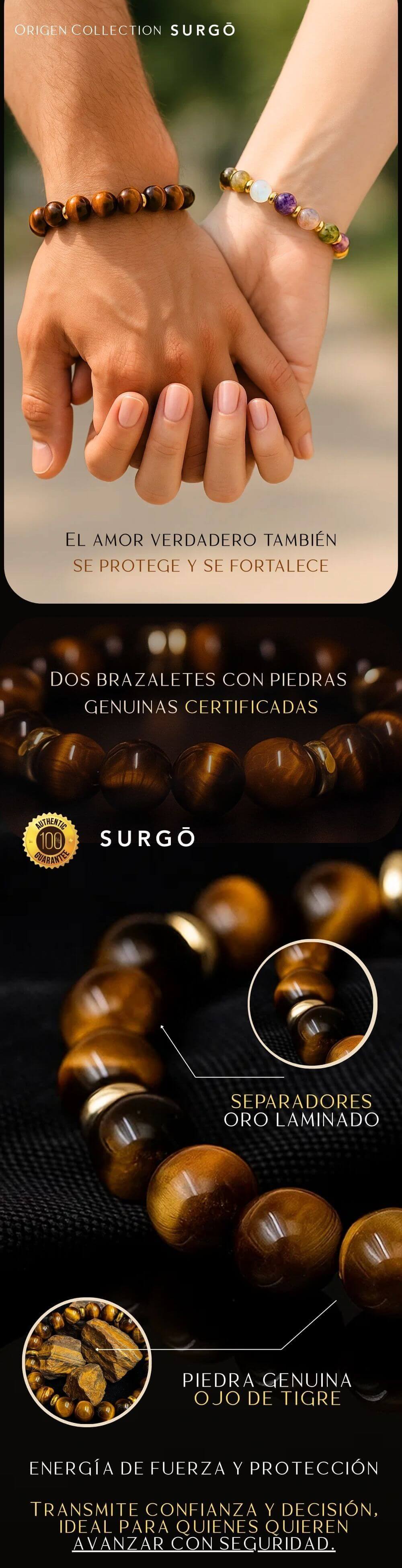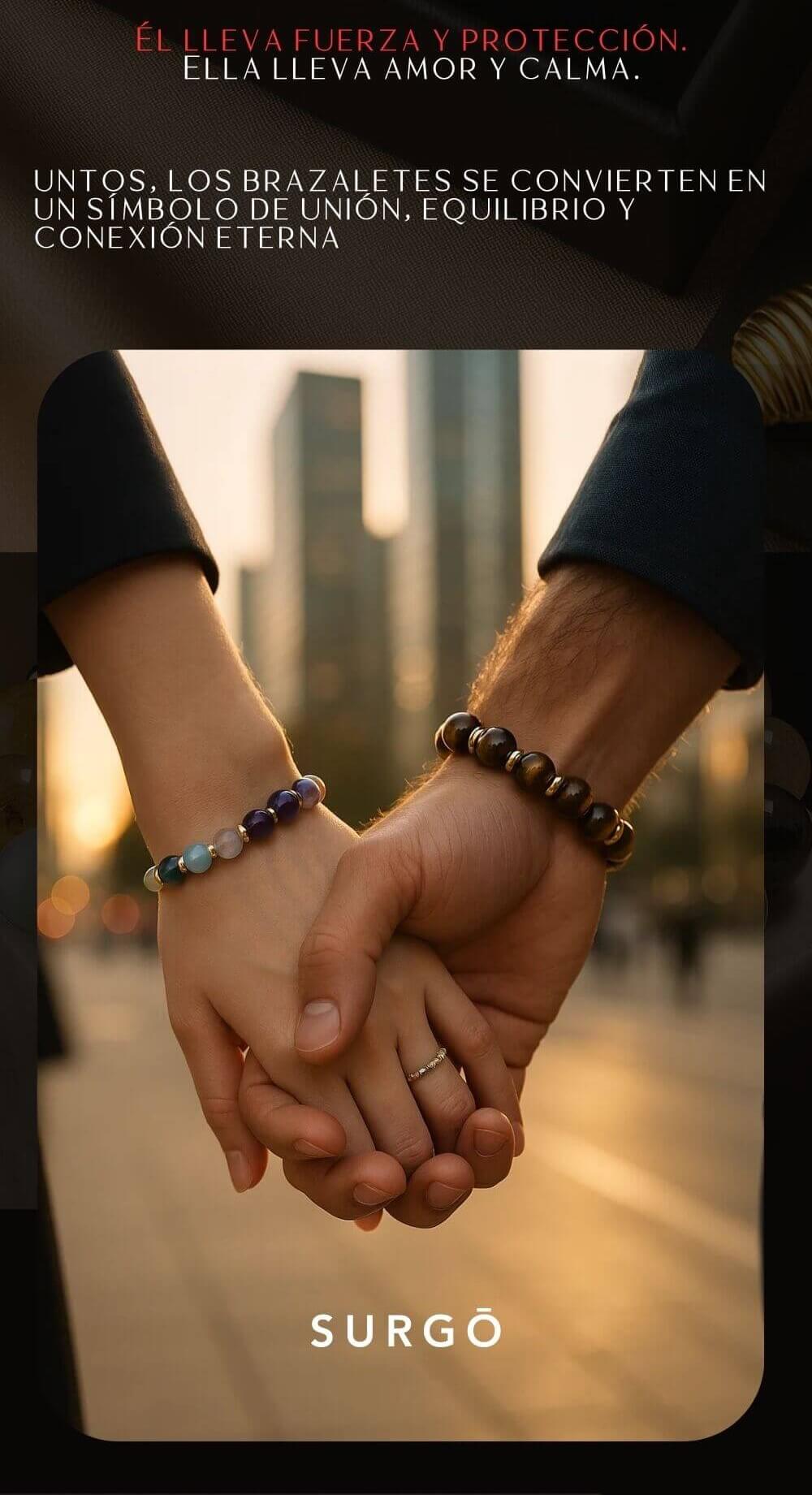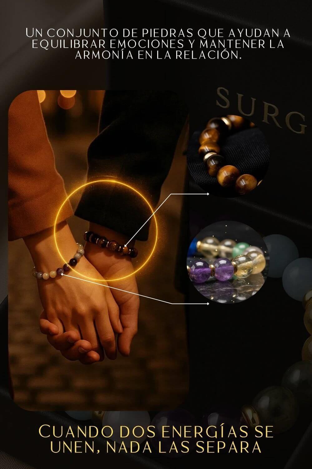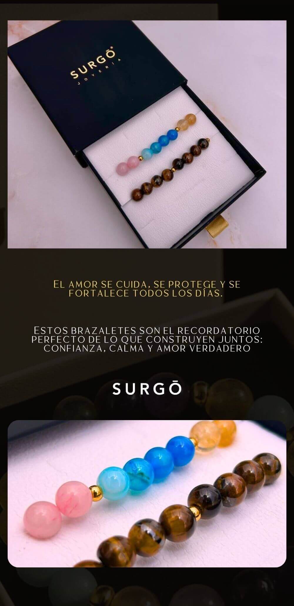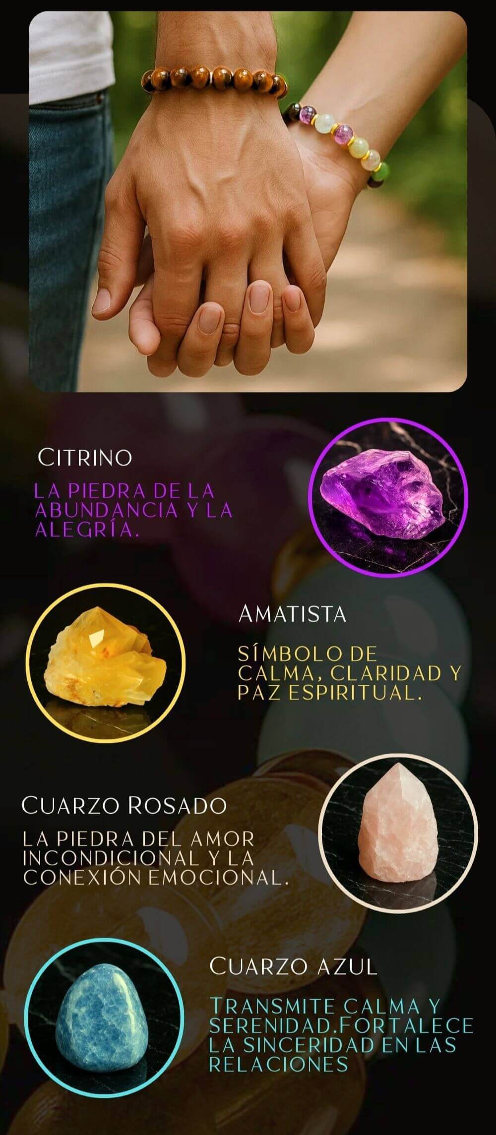 Sí. La caja incluye un brazalete masculino de Ojo de Tigre con separadores dorados, símbolo de fortaleza y protección, y un brazalete femenino de cuarzos naturales (amatista, citrino, rosado y azul) que transmiten amor, equilibrio y serenidad.