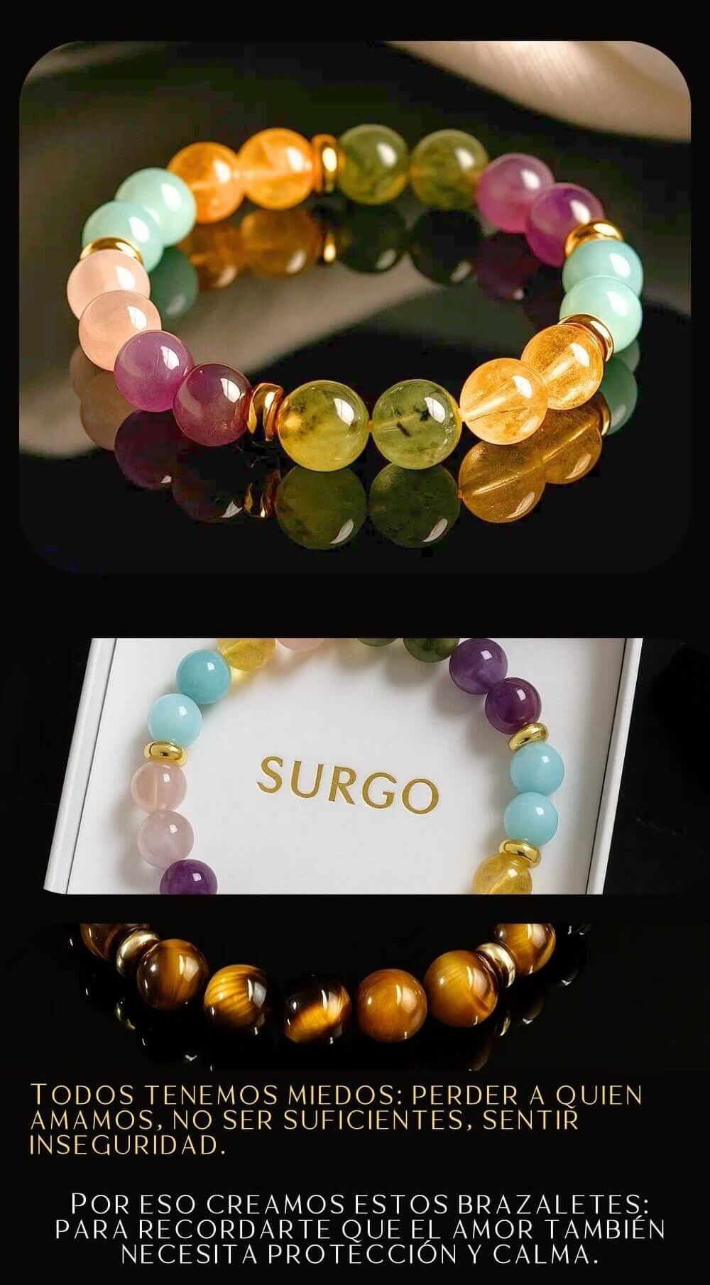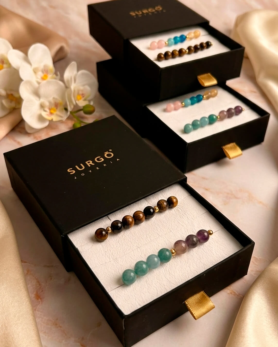 Cada set llega en una caja de lujo sellada con la marca SURGO, cuidadosamente empacada y lista para regalar. Su presentación premium transmite elegancia, protección y energía desde el primer momento.