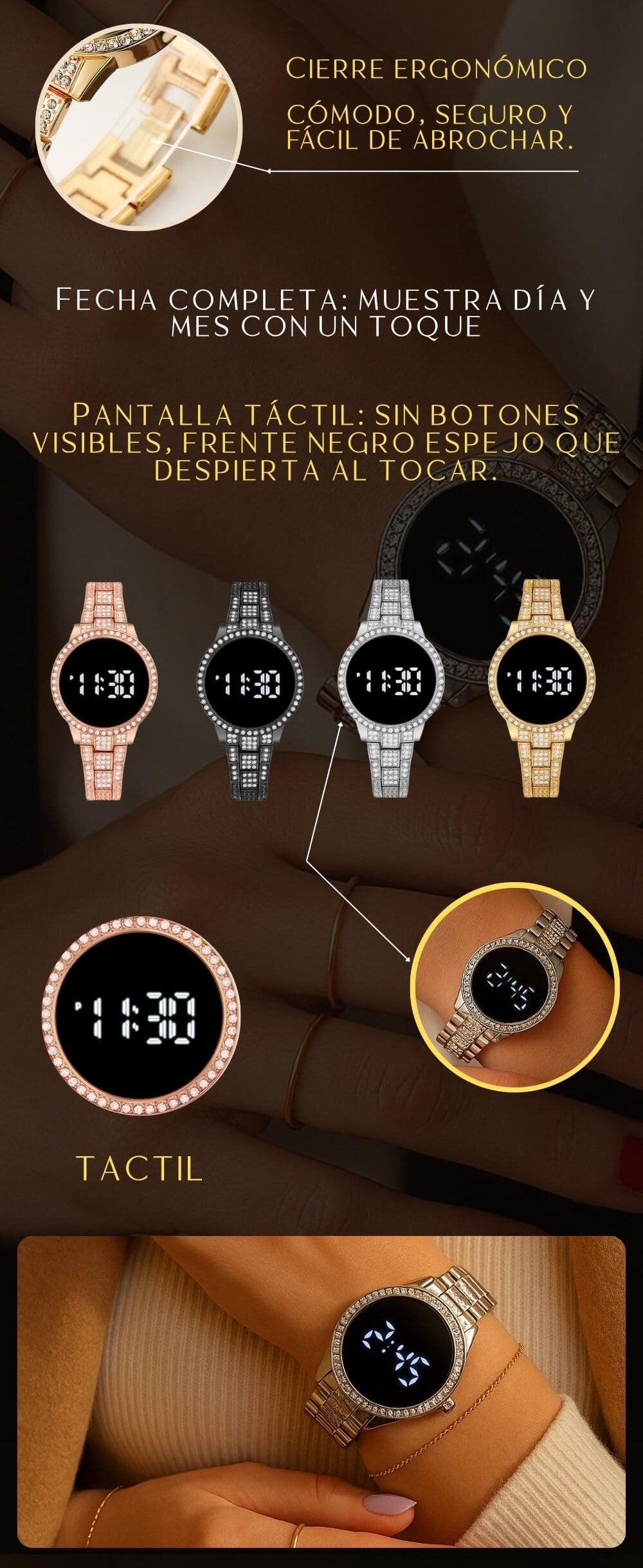 Brilla sin esfuerzo. Un reloj para dama con incrustaciones de simulación de diamantes, pantalla táctil y panel LED blanco que muestra hora, día y mes al toque. Disponible en dorado, negro, plata y oro rosa. Pago contra entrega en todo Ecuador.